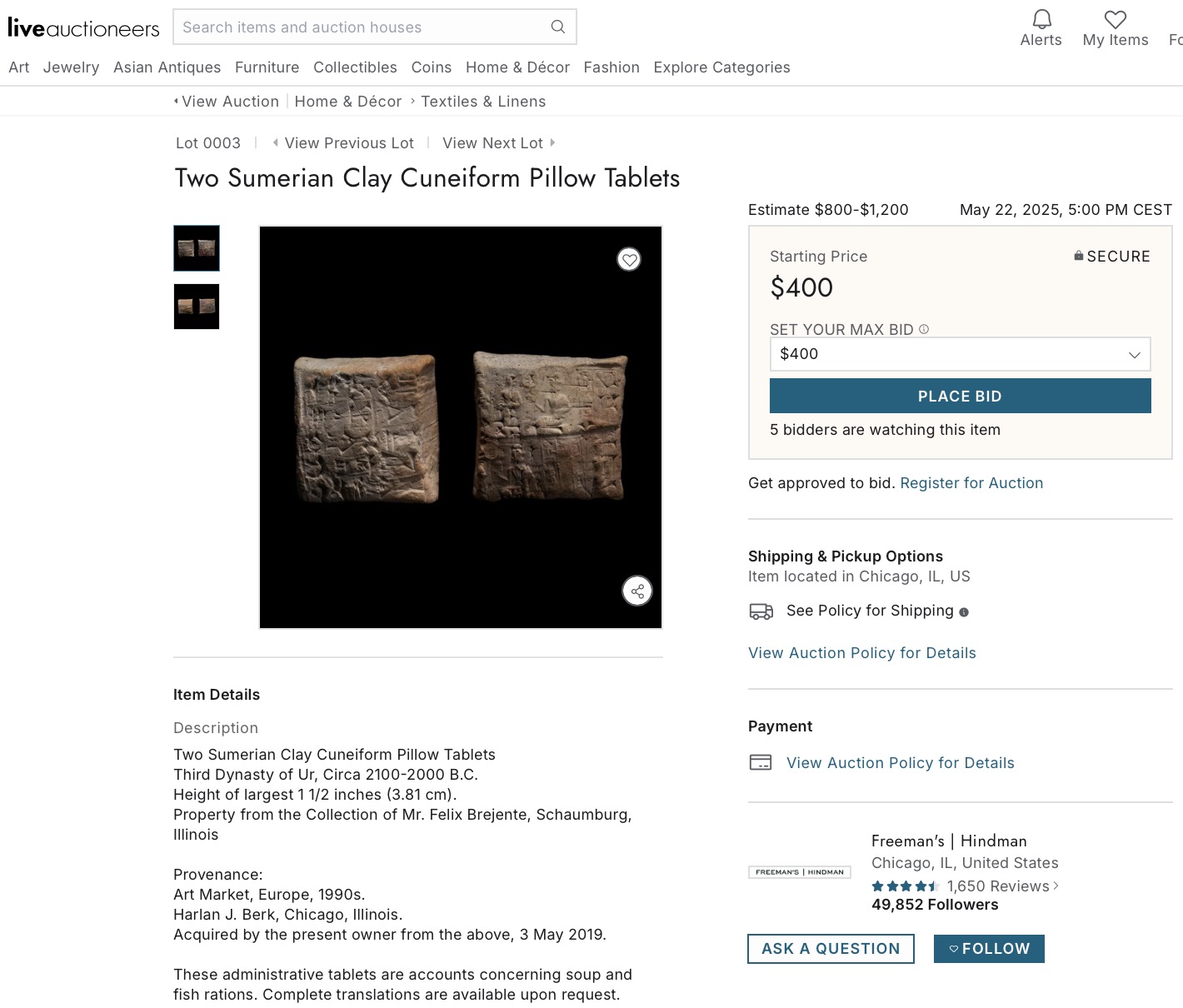https://www.liveauctioneers.com/item/205059208 https://hindmanauctions.com/auctions/6344-c11173d8-3cc7-45c0-80c1-aed333949d35/lot/3 «Description Two Sumerian Clay Cuneiform Pillow Tablets Third Dynasty of Ur, Circa 2100-2000 B.C. Height of largest 1 1/2 inches (3.81 cm). Property from the Collection of Mr. Felix Brejente, Schaumburg, Illinois Provenance: Art Market, Europe, 1990s. Harlan J. Berk, Chicago, Illinois. Acquired by the present owner from the above, 3 May 2019. These administrative tablets are accounts concerning soup and fish rations. Complete translations are available upon request.» [WEB] ------