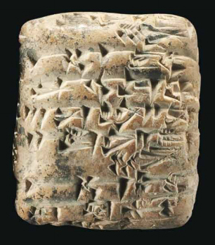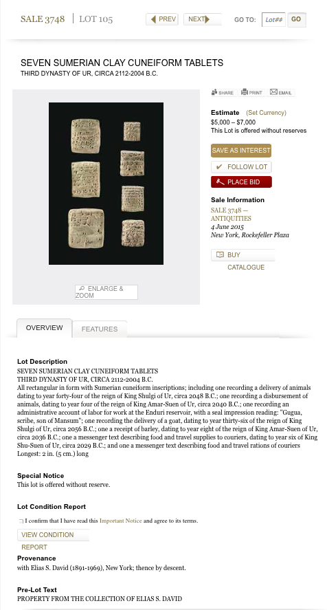https://www.christies.com/en/lot/lot-5903829 «SEVEN SUMERIAN CLAY CUNEIFORM TABLETS THIRD DYNASTY OF UR, CIRCA 2112-2004 B.C. All rectangular in form with Sumerian cuneiform inscriptions; including one recording a delivery of animals dating to year forty-four of the reign of King Shulgi of Ur, circa 2048 B.C.; one recording a disbursement of animals, dating to year four of the reign of King Amar-Suen of Ur, circa 2040 B.C.; one recording an administrative account of labor for work at the Enduri reservoir, with a seal impression reading: "Gugua, scribe, son of Mansum"; one recording the delivery of a goat, dating to year thirty-six of the reign of King Shulgi of Ur, circa 2056 B.C.; one a receipt of barley, dating to year eight of the reign of King Amar-Suen of Ur, circa 2036 B.C.; one a messenger text describing food and travel supplies to couriers, dating to year six of King Shu-Suen of Ur, circa 2029 B.C.; and one a messenger text describing food and travel rations of couriers Longest: 2 in. (5 cm.) long PROVENANCE with Elias S. David (1891-1969), New York; thence by descent.» [WEB] ------